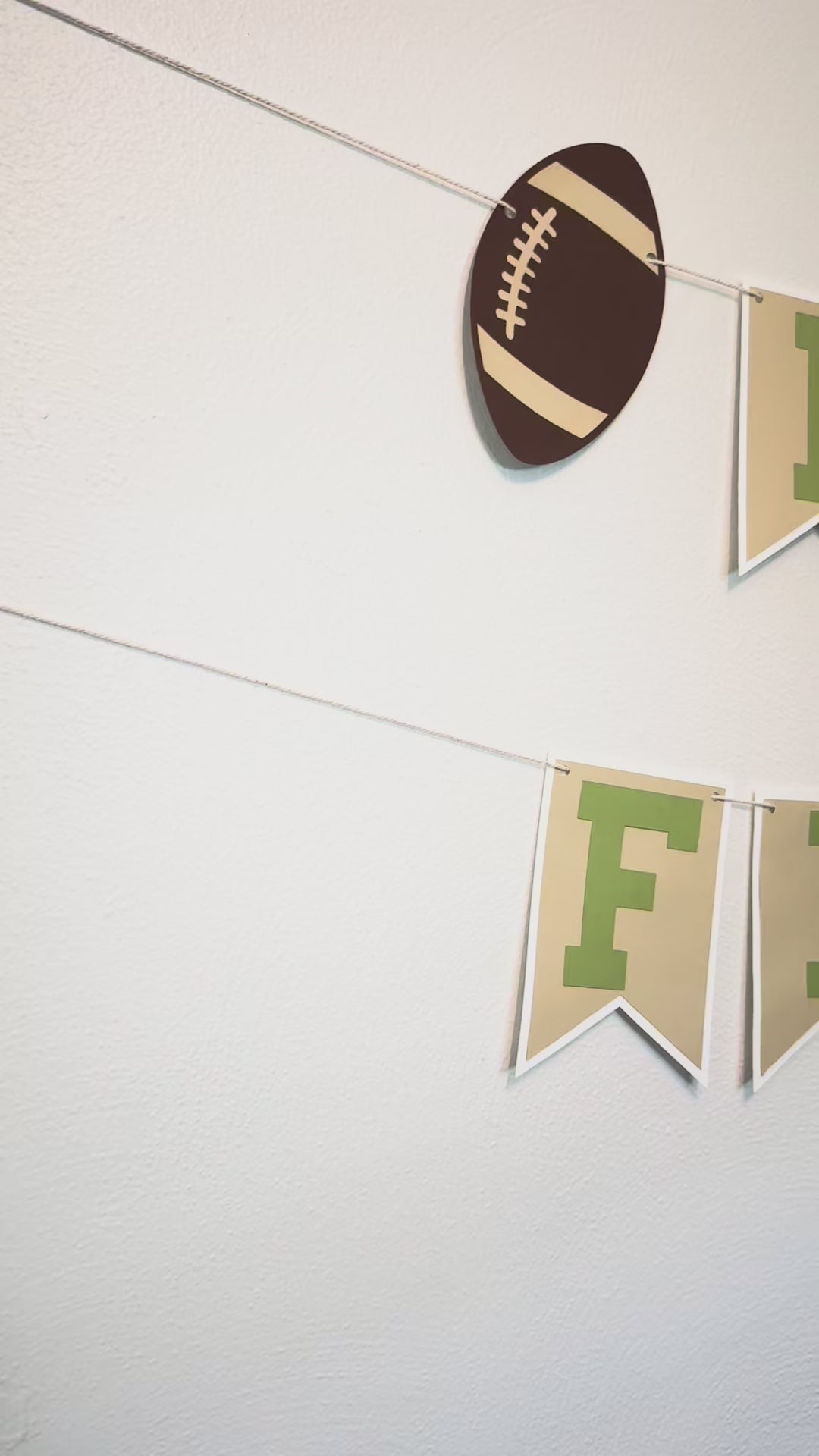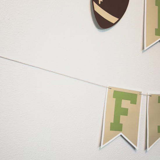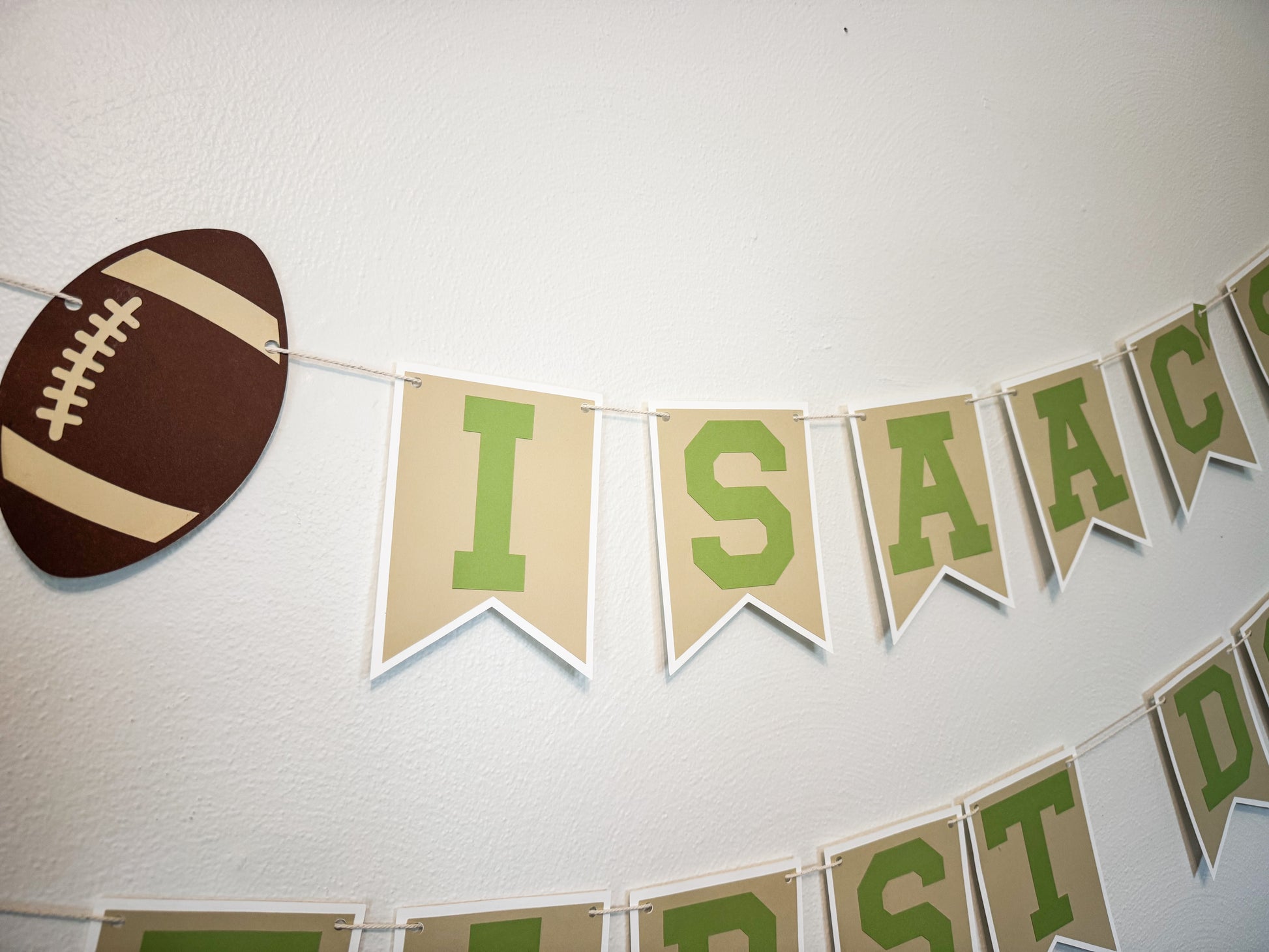 Set the stage for your football-themed birthday with this custom banner! “(Name)’s First Down” (or any custom message up to 25 letters) makes the cutest backdrop for highchair photos, cake tables, or wall décor. Finished with football accents to tie the whole theme together.