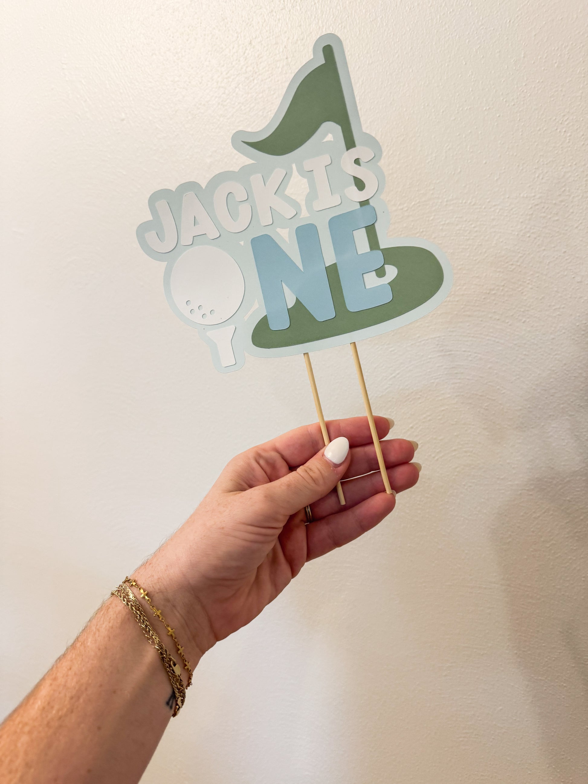 Make their birthday cake a hole-in-one! This layered cardstock cake topper features a golf green, flag, and ball, along with your child’s name and age. Adds the perfect finishing touch to your dessert table.
