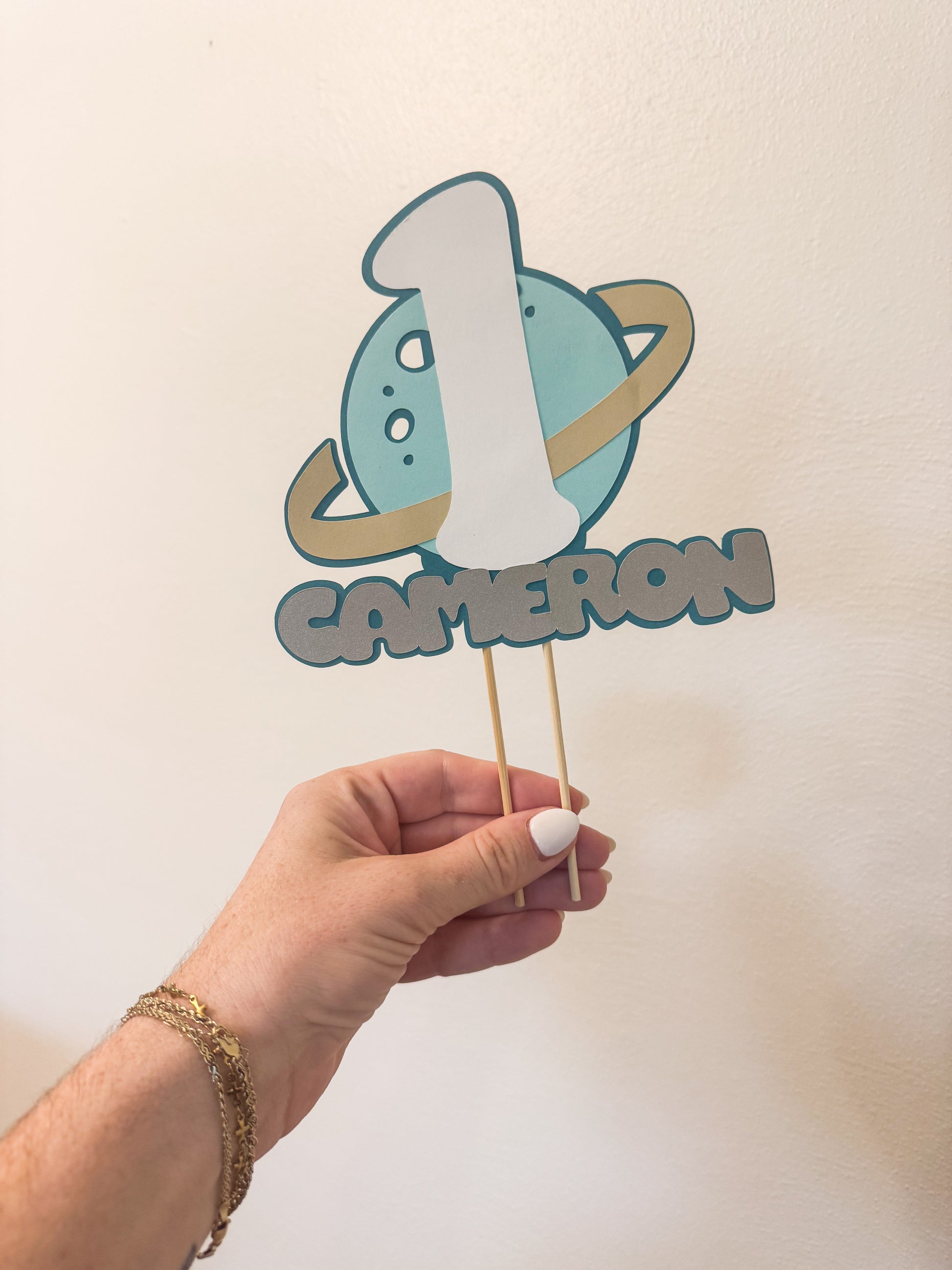 Take your cake to new heights! This personalized space cake topper features a planet and your child’s name + age. Double-layered cardstock for durability, attached to food-safe sticks.